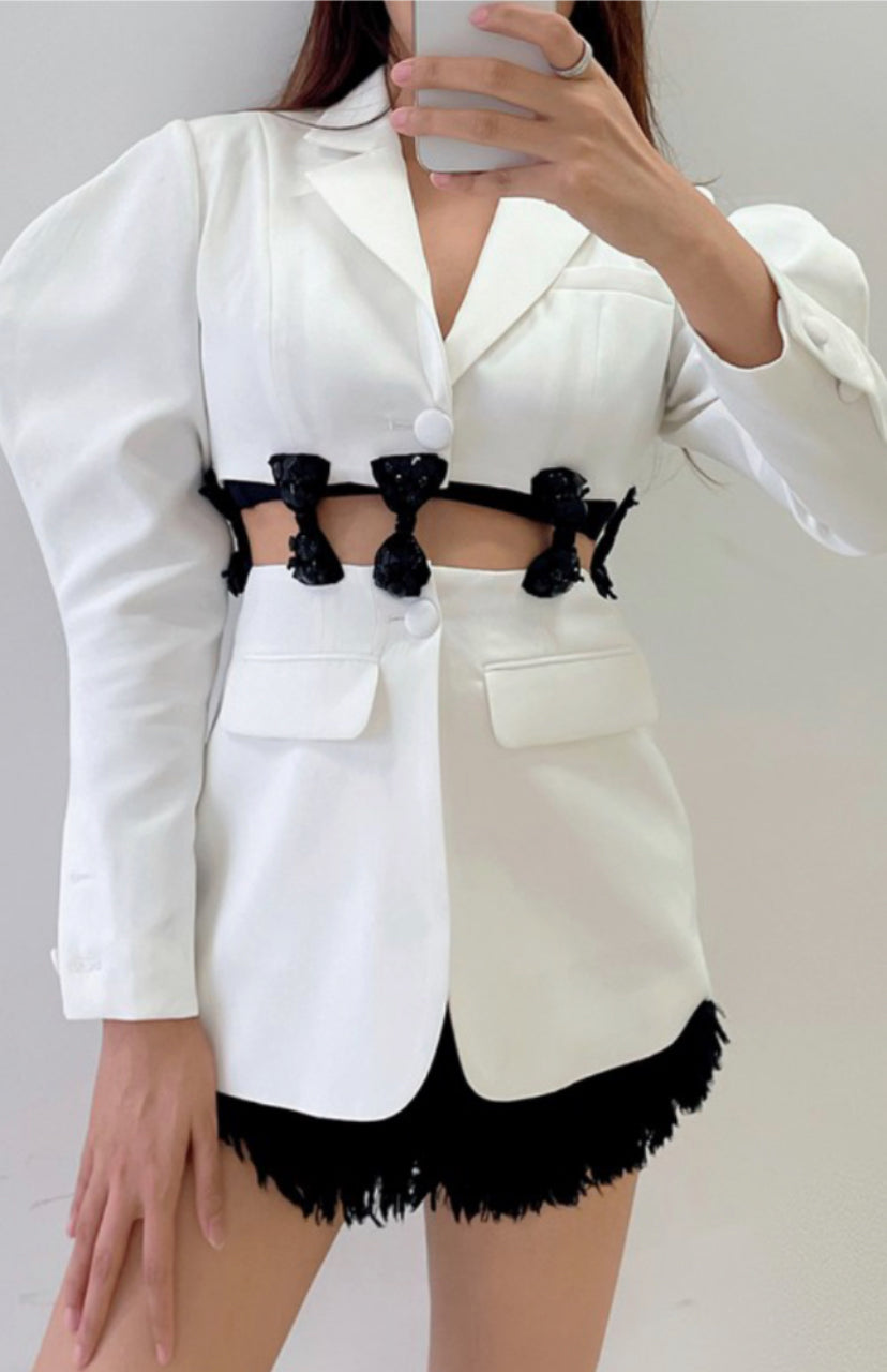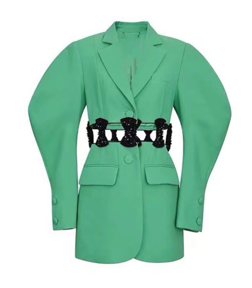 All eyes on you. This jaw-dropping blazer features dramatic puff sleeves, an oversized lapel, and intricate beaded bow details that cinch the waist with show-stopping cutouts. Finished with a two-button closure and flap pockets, it’s the perfect piece for commanding the room—whether in mint green or bold white.